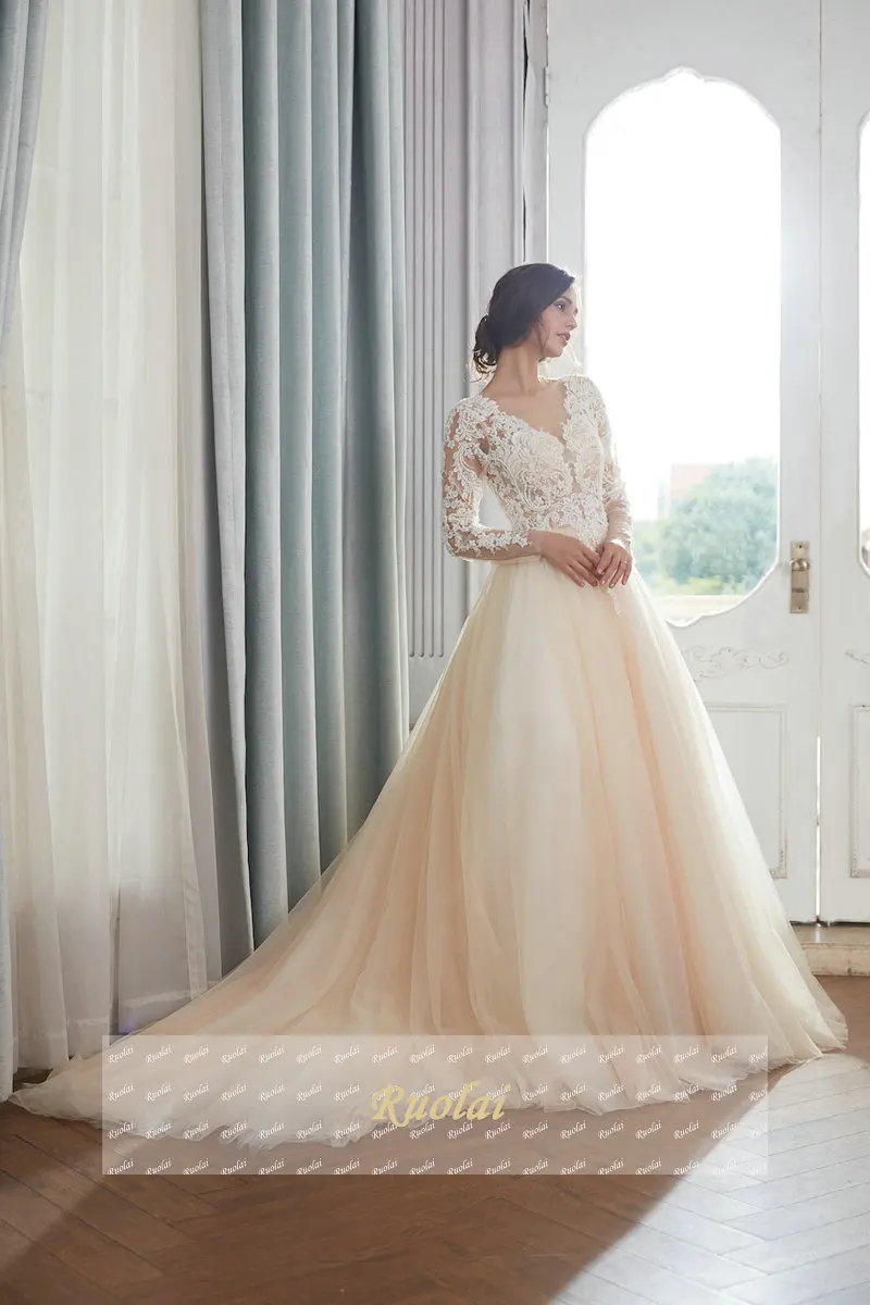 Vestido De Noiva Light Champagne Ball Gown Royal Wedding Dress 2018 Long Train Appliques Vintage Wedding Gown Bridal Dresses